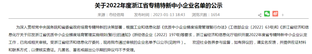 近日,浙江省经济和信息化厅公示2022年度浙江省“专精特新”中小企业名单,「B体育」-「中国」官网科技成功获评!