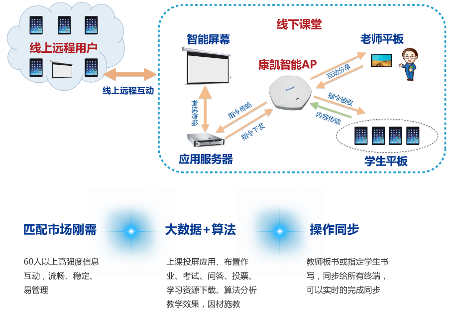 老师平板、学生平板、课堂大屏互动:基于大数据,用算法分析教学效果,精准教学。